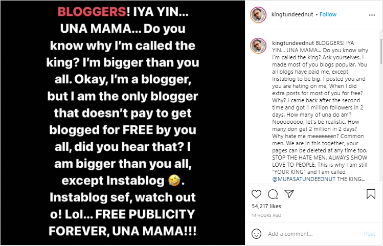 “BLOGGERS! IYA YIN… UNA MAMA… Do you know why I’m called the king? Ask yourselves. I made most of you blogs popular. You all blogs have paid me, except Instablog to be big. I posted you and you are hating on me, When I did extra posts for most of you for free? Why?