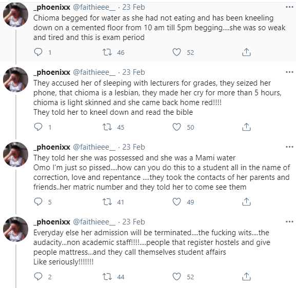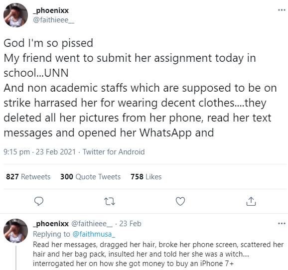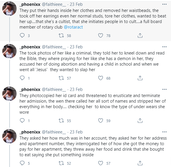 The friend claimed a nonacademic staff accosted the student, accused her of being a cultist and a prostitute. She also claimed the staff accused her of committing abortion and collected her phones, then went through her social media and more.
