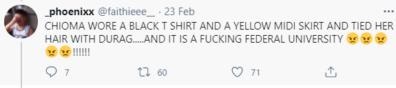A friend of the abused student said the lady was wearing a “black t-shirt, yellow midi skirt, and tied her hair with durag.”