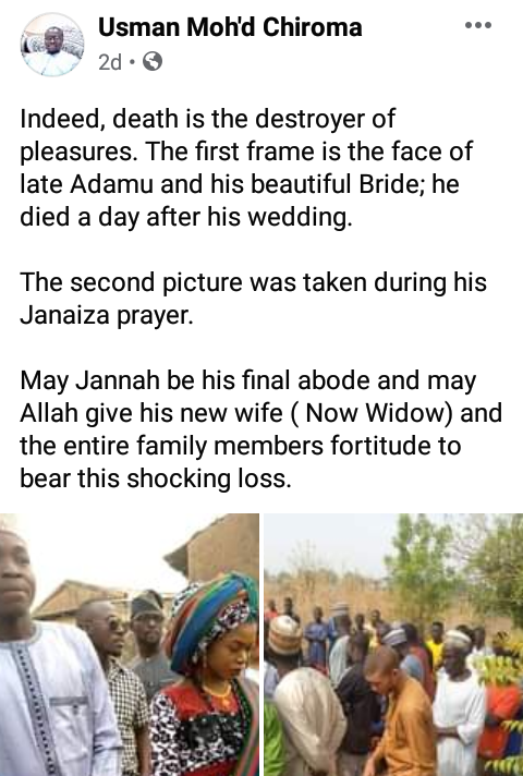 “Indeed, death is the destroyer of pleasures. The first frame is the face of late Adamu and his beautiful Bride; he died a day after his wedding. The second picture was taken during his Janaiza prayer,” Chiroma wrote on Monday, March 1.