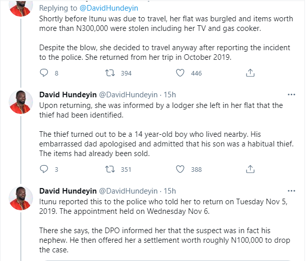 “Shortly before Itunu was due to travel, her flat was burgled and items worth more than N300,000 were stolen including her TV and gas cooker,” he continued.