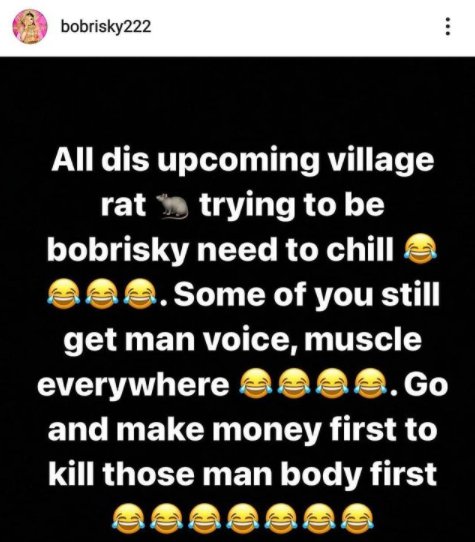 ”Dis messages is for those crackheads trying to be like bobrisky. World has only one bobrisky !!!!!!!! I promise I will never let anyone of u known. Since you all wanna be stupid I will be here sitting on your glory. Non of you will shine till I RETIRED !!!!!!!!!!!!!!! Don’t forget I’m d MOST CONTROVERSIAL IN AFRICA. Una don jam”