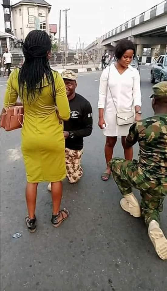 Two Nigerian soldiers have gone viral after photos of them proposing to their girlfriends in the street of Delta surfaced online.