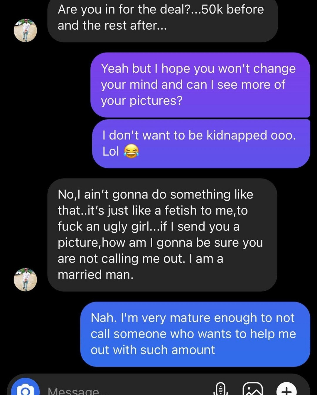 The man explained in the chat that he fantasizes about having sex with an “ugly” woman and that’s why he wants to have sex with Adetutu.