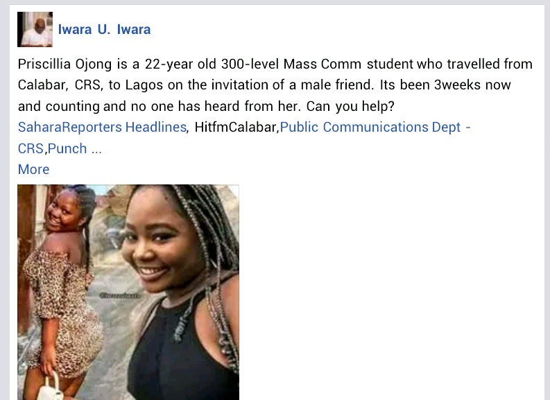 Priscilla Ojong, a 22-year old Mass Communication student of the Cross River University of Technology, has been declared missing.
