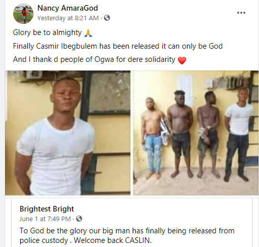 A native of Ogwa community who confirmed that Ibegbulam has been released, wrote; Glory be to almighty