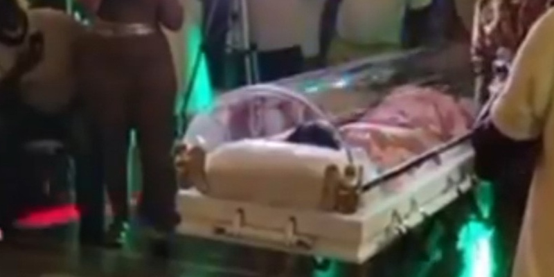 In a video that has now gone viral, the celebrant was wheeled into the venue in a glass-topped casket while a poem titled “Life After Death” was recited as she made her entrance.
