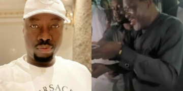 Billionaire club owner, Obi Cubana was captured hilariously making a sign of the cross as Nollywood actor Kanayo O. Kanayo sprayed him money at his mother’s burial ceremony in Oba, Anambra state.