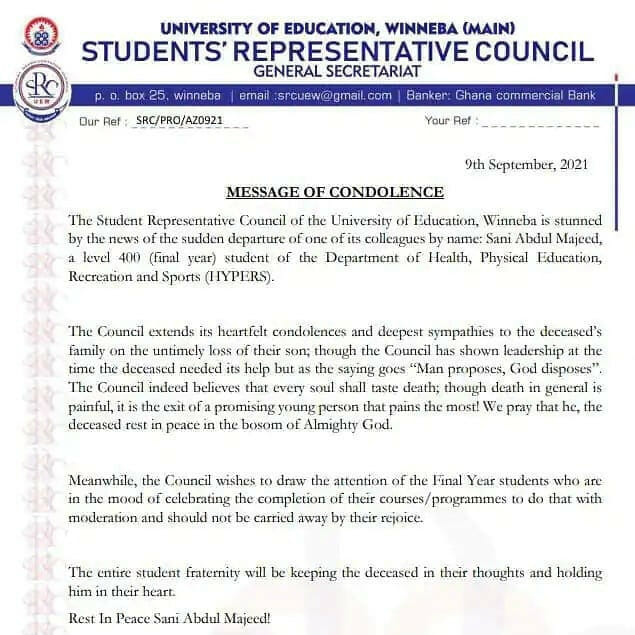 The Students’ Representative Council of the university released a message of condolence to sympathize with the family of the deceased.