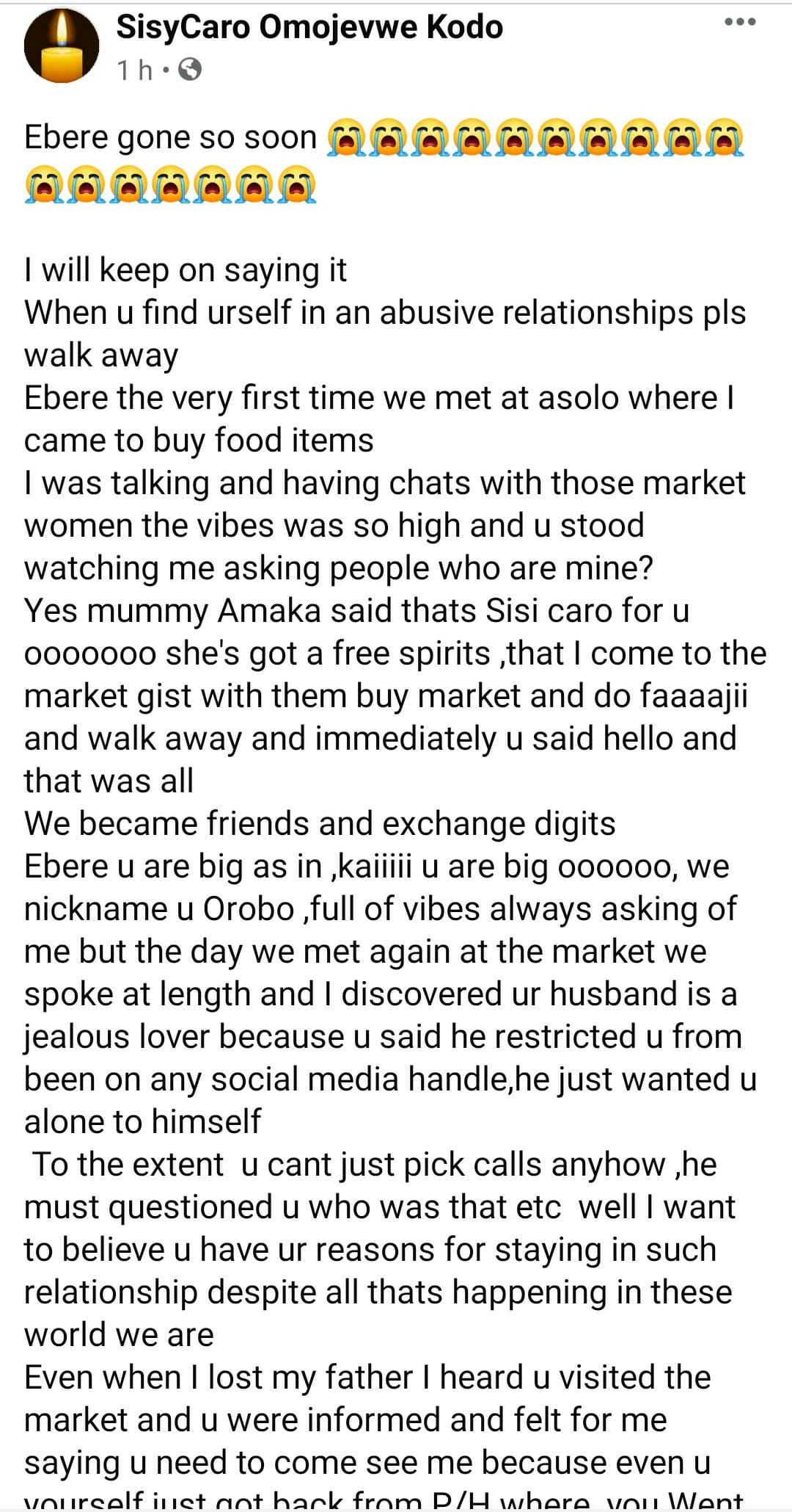 According to the deceased’s friend, SisiCaro Omojevwe Okodo, who took to Facebook to mourn Efe, said the deceased had travelled for her mother’s burial preparations and returned home without her luggage. When her husband asked why, she explained that she plans to travel again soon so didn’t think it necessary to bring her belongings back with her.