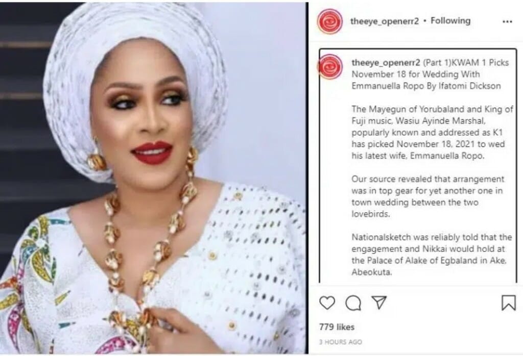 “The Mayegun of Yorubaland and King of Fuji music, Wasiu Ayinde Marshal, popularly known and addressed as K1 has picked November 18, 2021 to wed his latest wife, Emmanuella Ropo.