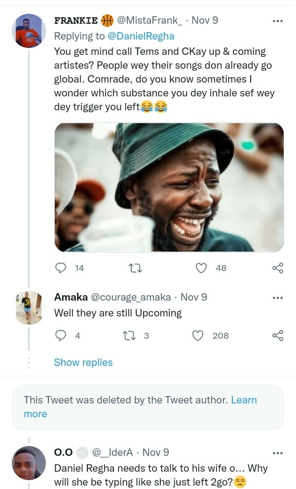Twitter user, Daniel Regha has stormed the bird app page to pour out his mind over critics disrespecting the pioneers of afrobeats music after the recent achievements of Nigerian Singers Tems , Ckay and other Upcoming Artistes.