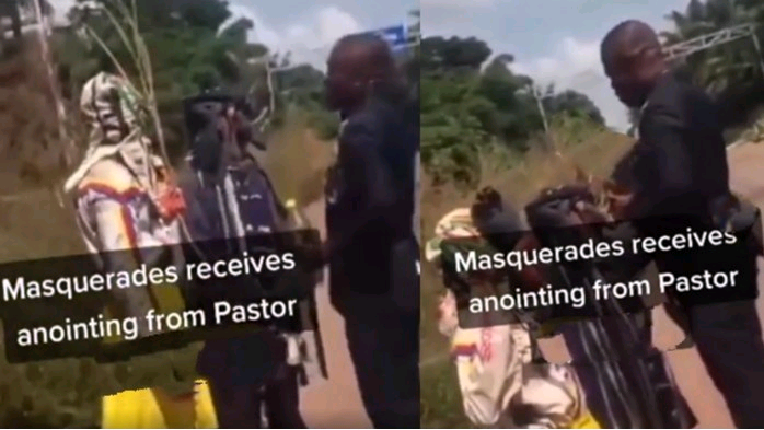 A video which has gone viral on social media shows the moment a Nigerian pastor converted three masquerades to Christianity.