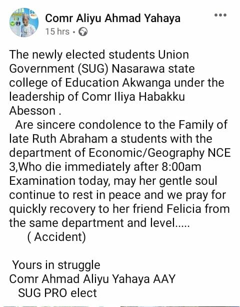 The President of Students Union Government, SUG, of the institution, Comrade Iliya Habakku Abesson sent their sincere condolence to the family of the deceased and wished the survived course mate, Felicia quick recovery.