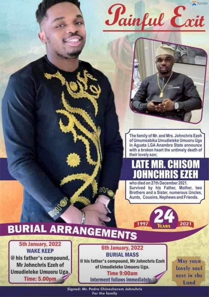 “God knows the best, but your demise is painful! Late Chisom Johnchris Ezeh who his sudden painful death occurred on Monday 27th December 2021, will be buried on Thursday 6th January 2022 @ his father’s compound in Umu-Umeabiaka Umudieleke Umuoru Uga, Aguata LGA, Anambra State.” one Umelechi wrote.