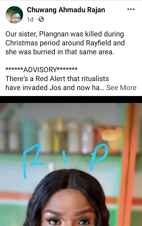 “There’s a Red Alert that ritualists have invaded Jos and now have a market for selling human parts in the state. Recently, the Corpse of this young lady(Plangnan) a resident of Chwel-Nyap Congo Russia Area of Jos North was found near PRTV in Rayfield Area of Jos South with some of her Private Parts removed.
