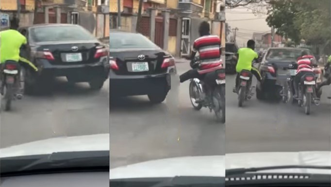 Three Bike Riders could be seen pushing the car from behind with their legs and hands and it sparked reactions from Nigerians online.