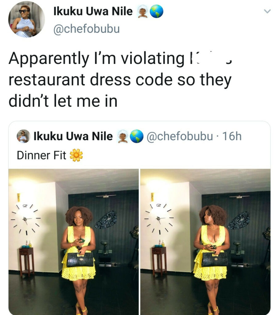 A chef has disclosed that she was denied entry into a Lagos restaurant due to her appearance.