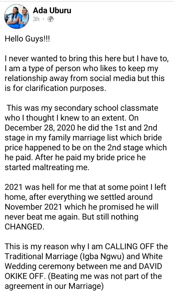 A Nigerian lady Identified as Ada Uburu has taken to social media to announce that she called off her wedding because her fiance physically abused her. The young lady was supposed to walk down the aisle in 3 days.
