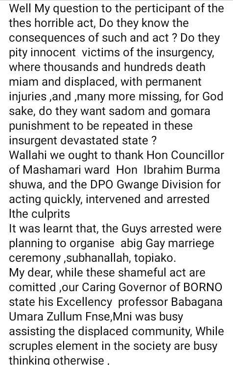 “Homosexuality is a taboo in the culture of kanem BORNO and whole world at large, the punishment from religion perspectives of both Muslim and Christians are severe resulting to killing etc,”