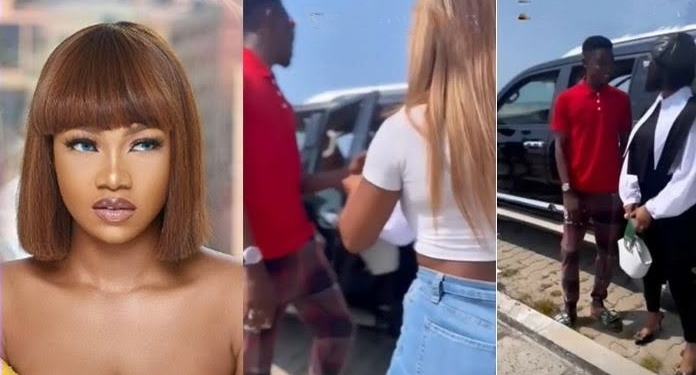 The Controversial BBNaija Star happened to have noticed him at the roadside and got down from her vehicle to greet the young man who probably revealed that he is a fan of hers.