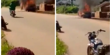 A video which has gone viral showed the attacked car burning by the roadside while motorcycle operators moved freely as if nothing happened in the area.