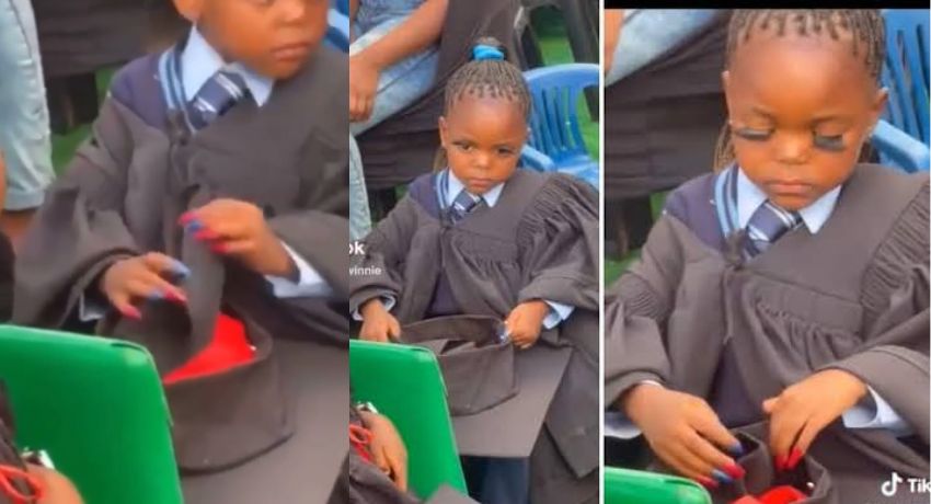 The little girl who may be about 7 years old seemed to be graduating from nursery school. In the video, the girl wore her graduation gown and fiddled with her cap with her blue and red nails.