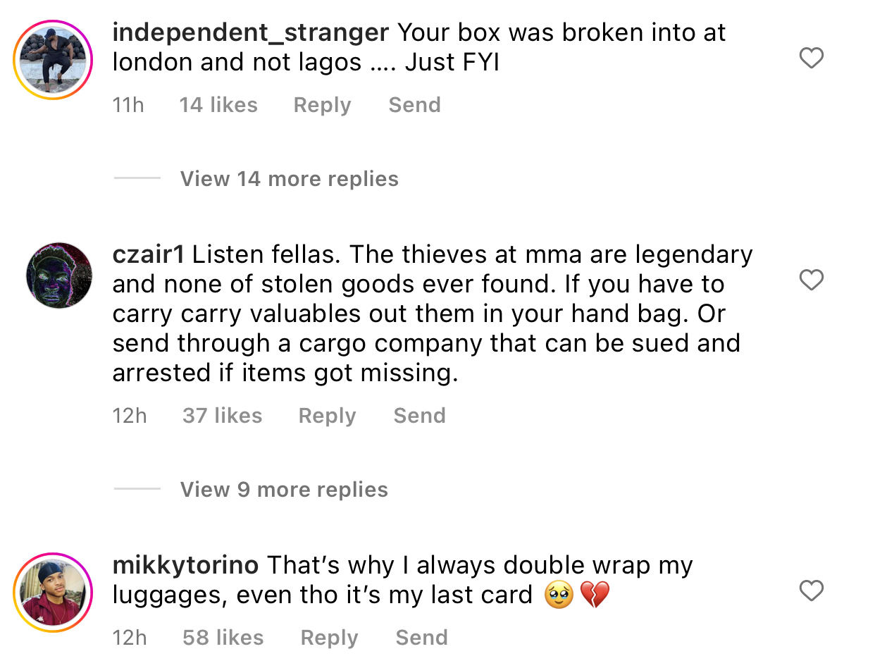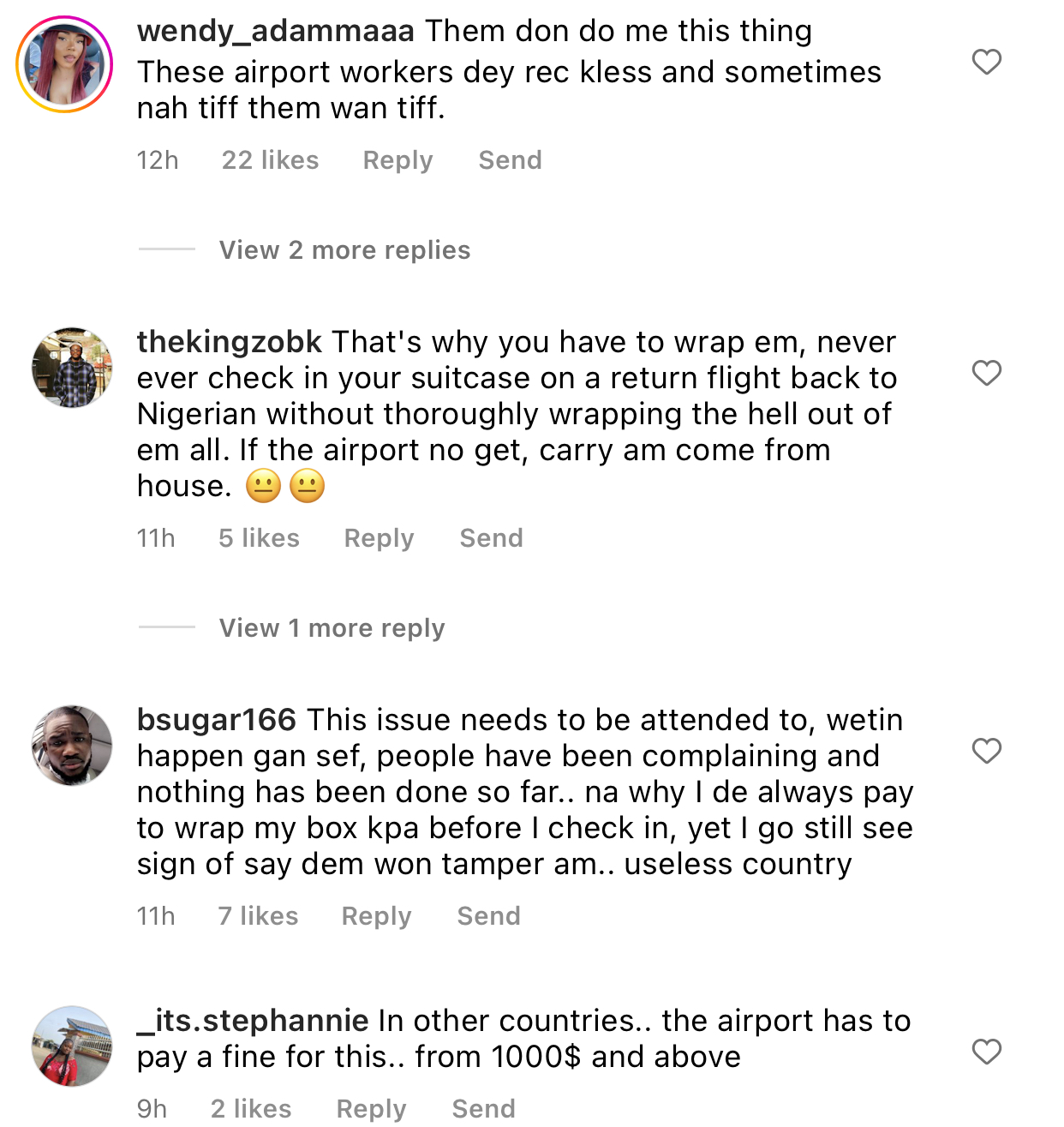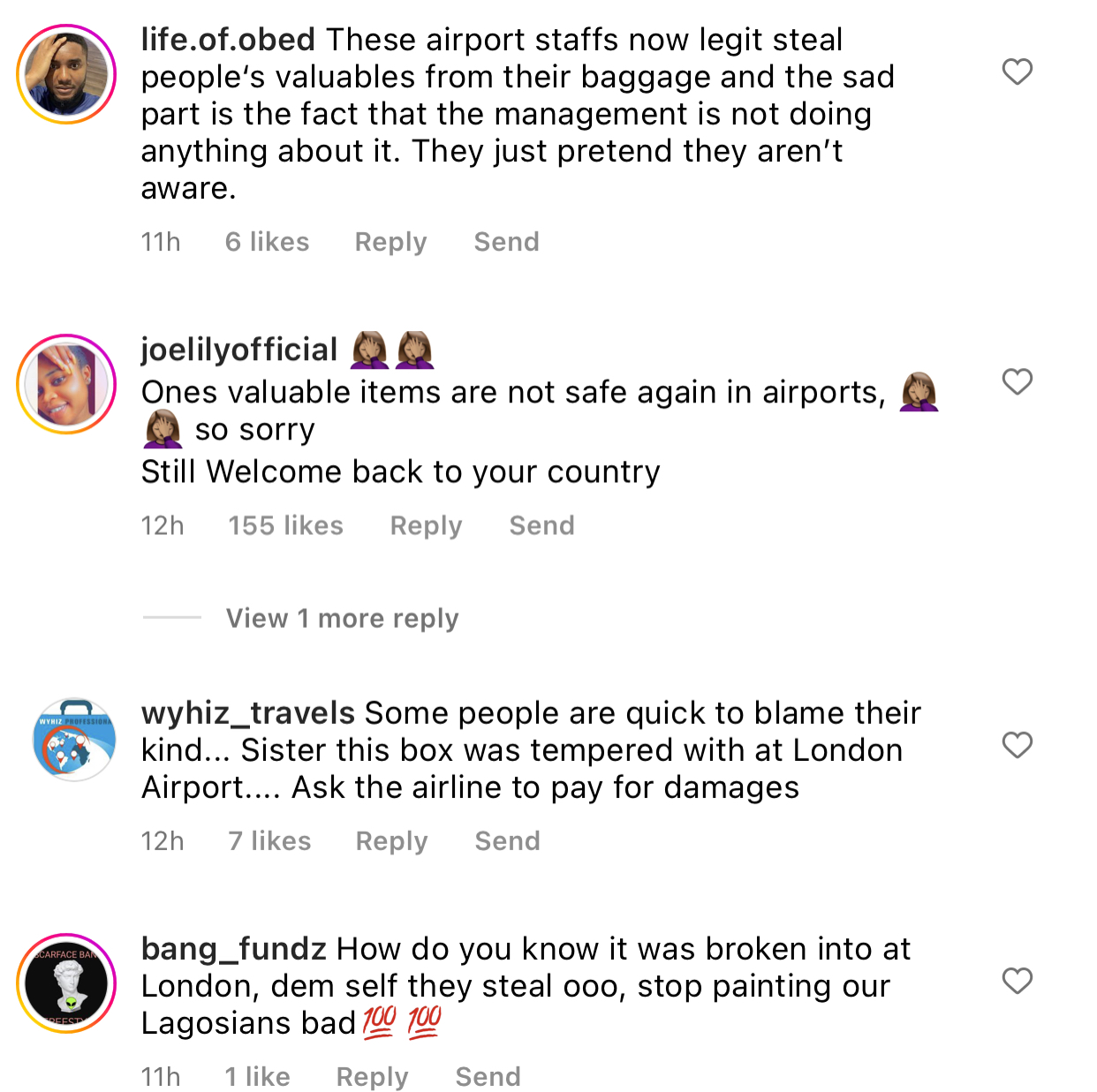 Netizens have related to Nigerian On-Air-Personality, Tope who lamented after her box was allegedly broken into at the Murtala Mohammed International Airport, Lagos.
