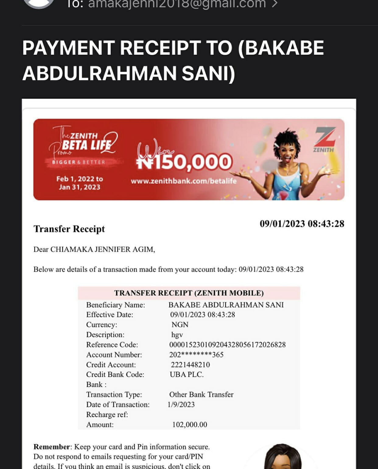 She called on Zenith bank to return the money and said that her card was not stolen or misplaced and after visiting the receiving bank to file a complaint, she was told that the money has been removed from the account.