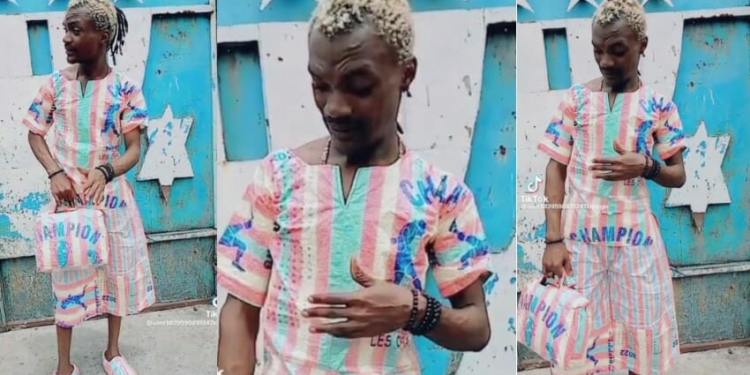 A man has left netizens amused for confidently rocking a two-piece outfit, slides, and handbag all made from ‘bagco’.