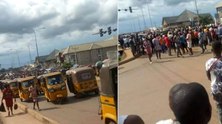 A heavy protest has erupted in Yenagoa, Bayelsa State after a tricycle (Keke) rider reportedly stabbed his male passenger to death.