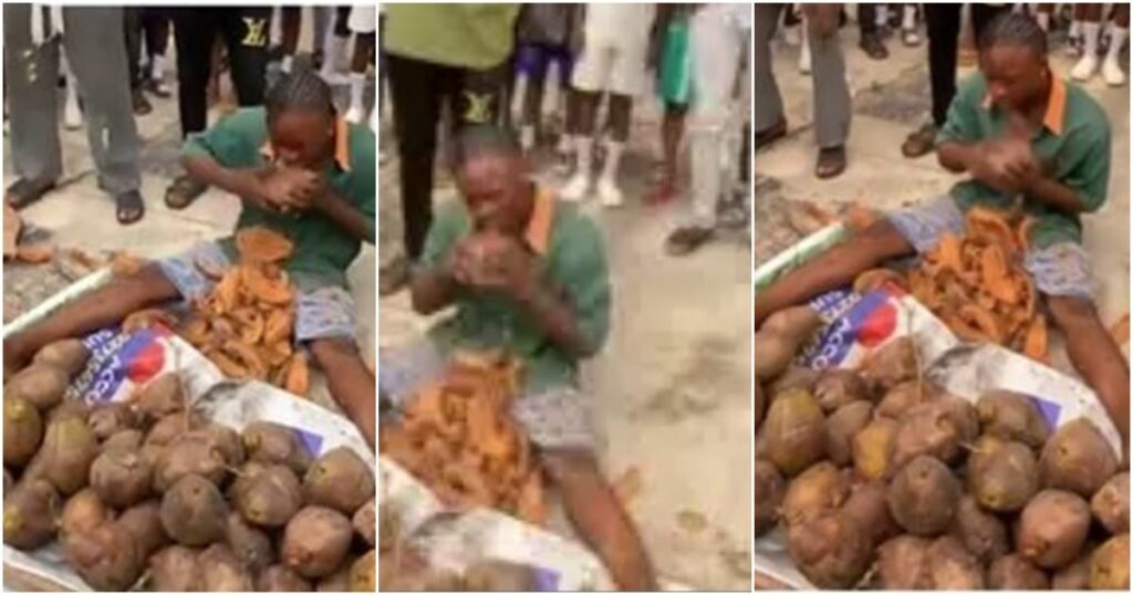 A video circulating on the internet captures the ambitious man in action as he aims to set a new record by skillfully peeling coconut husks with his formidable teeth.