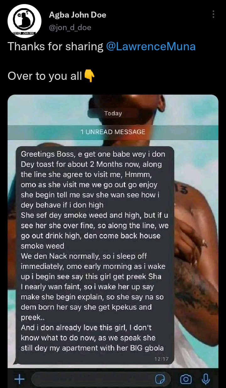 The lad who narrated his encounter with the lady via a WhatsApp chat, revealed that he has been wooing the lady for 2 months and when she finally visited him, they both smoked and got intoxicated.