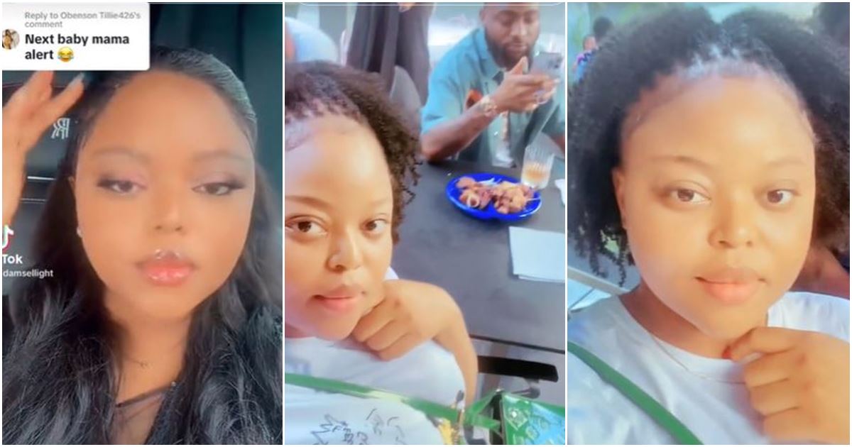 A Nigerian woman identified on TikTok by her handle as @damsel amassed the attention of many after she shared an exciting video capturing the moment when she took a selfie video with Davido in the background while he was eating.