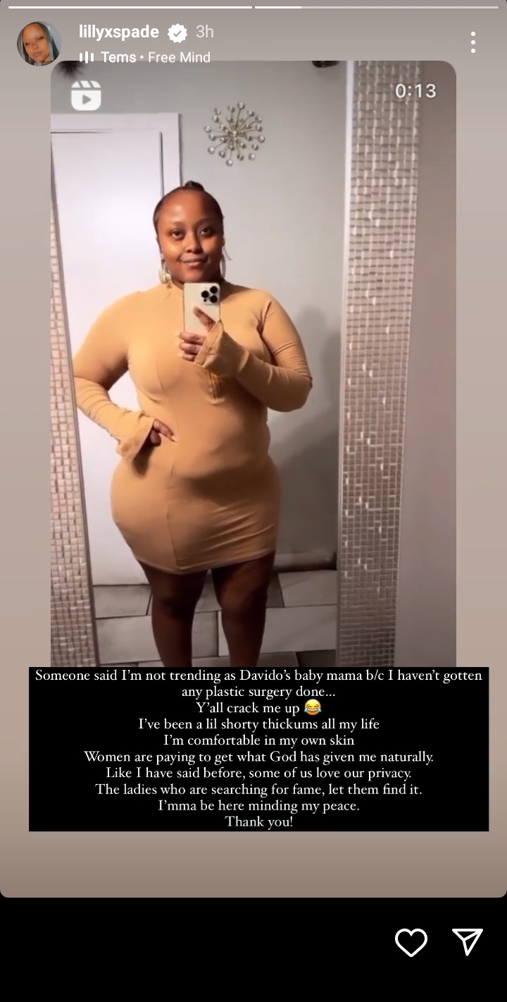 A Kenyan lady identified on Instagram as @Lillyxspade has hinted at being among singer Davido’s baby mamas.