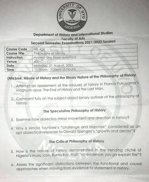 - The question paper which has gone viral showed that it emanated from the Department of History and International Studies, University of Uyo.