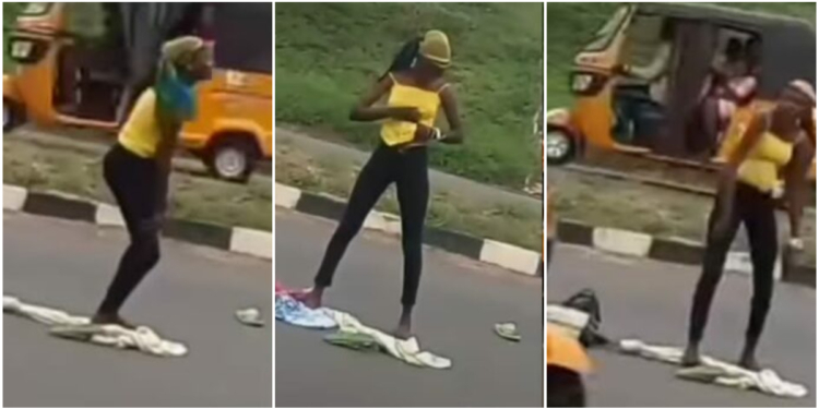 A young lady was observed displaying unusual behavior after reportedly being dropped off by an alleged “yahoo boy” in the middle of a busy road.