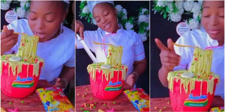 “Agba Baker” – Lady stirs up reactions as she shows off mind-blowing Indomie cake (Video)