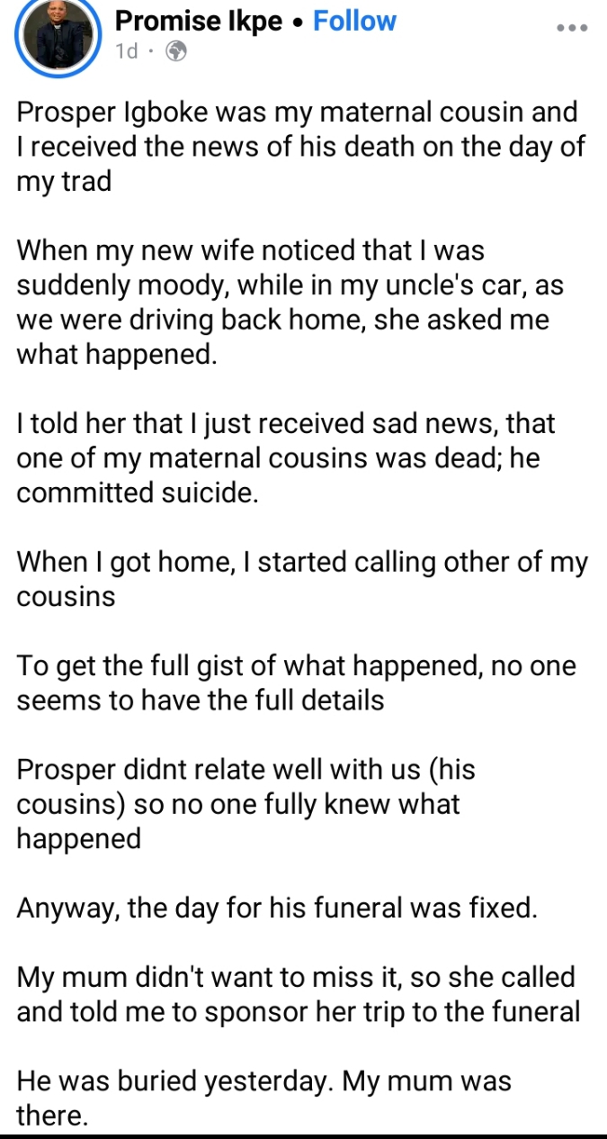 However, a maternal cousin of the deceased by the name of Promise Ikpe took to his Facebook page to debunk the viral report. In doing so, he unveiled the intricate circumstances surrounding the passing.