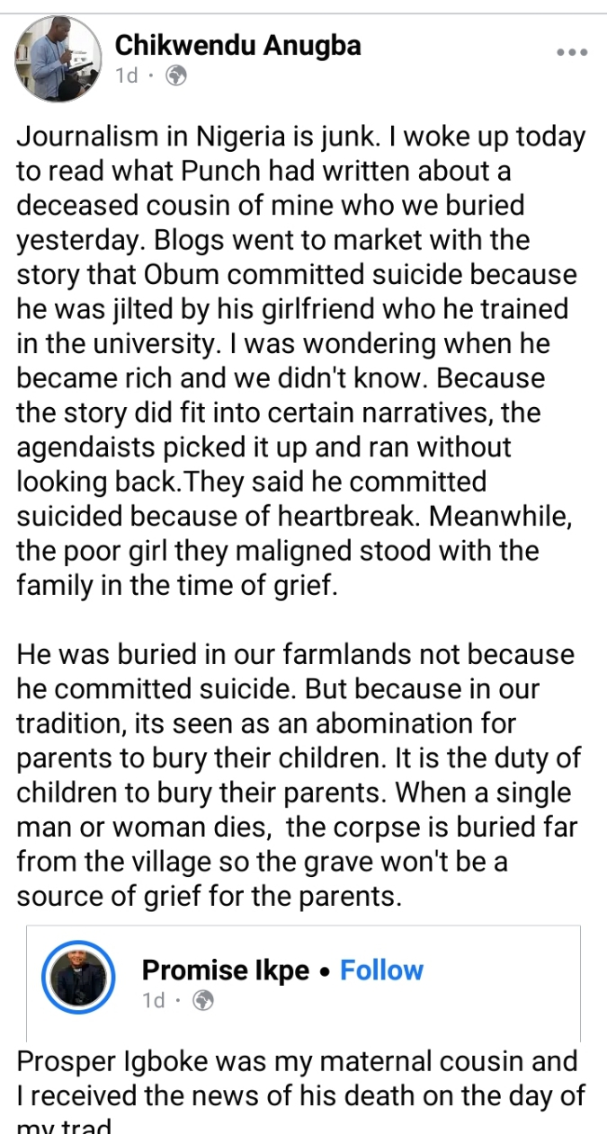 “Blogs went to market with the story that Obum committed suicide because he was jilted by his girlfriend who he trained in the university.