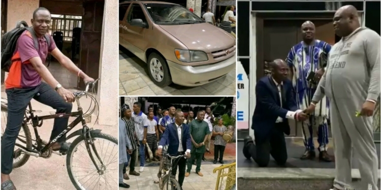 Adding to the grandeur of the occasion, the clergyman bestowed a car as a gift upon his guest, resulting in the fatigued cyclist being deeply moved with joy. Overwhelmed by his emotions, the cyclist even lay flat on the ground as a heartfelt gesture of appreciation. Chibuzor added that he gave the pastor N100k to get fuel for the new vehicle