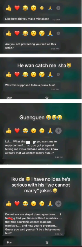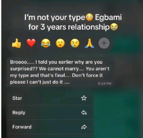 He allegedly told her that she knows they cannot marry because she’s not his type and he had only been with her just so she doesn’t feel lonely.