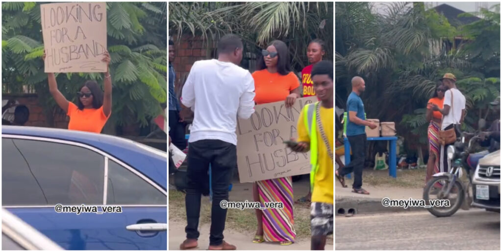 A Nigerian lady, Meyiwa Vera, was seen on the streets holding a placard with a rather unconventional message: “Looking for a husband.”