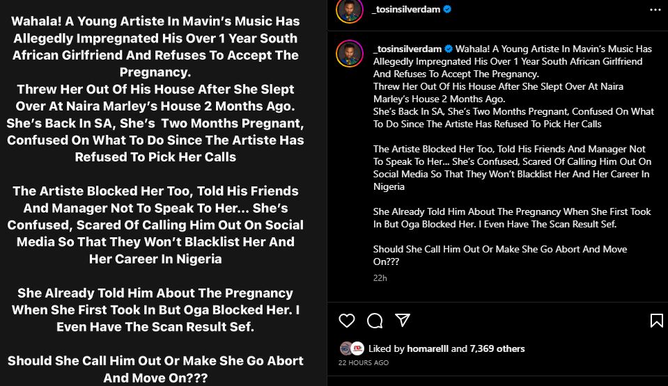 - Gossip vlogger, Tosin Silverdam has alleged that a young artiste in Mavin Records (name undisclosed) has impregnated his South African girlfriend and refused to take responsibility.