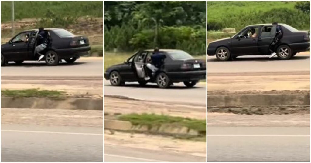 The video, which has been widely shared on various social media platforms, depicts a harrowing scene in which a man desperately clings to a moving car, its door left ajar.