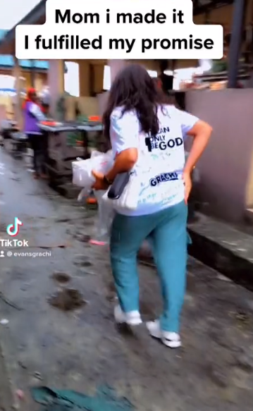 The video, aptly captioned “Mom, I made it, I fulfilled my promise,” showed the fresh graduate arriving at her mother’s workplace, donning her NYSC kit.