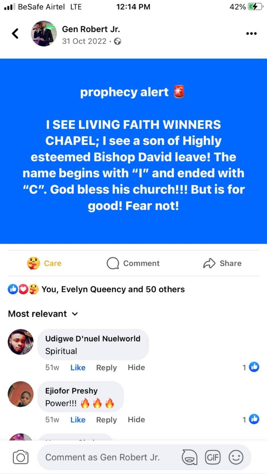 “Prophecy alert. “I see Living Faith Winners Chapel; “I see a son of highly esteemed Bishop David leave! “The namem begins with ‘I’ and ended with ‘C’. “God bless his church!!! But is for good! Fear not!”