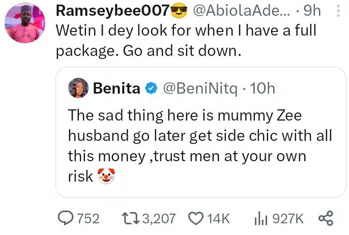 Benita wrote: “The sad thing here is mummy Zee husband go later get side chic with all this money ,trust men at your own risk 🤡”