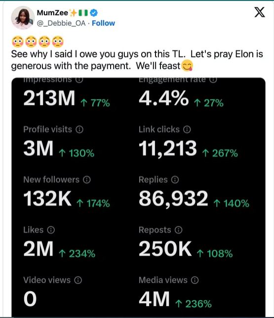 Celebrating her remarkable achievements, Mummy Zee expressed anticipation regarding potential payment from the platform, considering the significant engagement and impact her posts had generated.