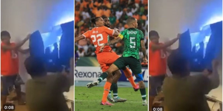A circulating video on social media captures the distressing scene where an enraged football enthusiast destroyed his television set following Nigeria’s loss to Ivory Coast.